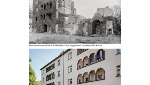 Viele Bewohner*innen von Neu-Tempelhof denken, dass die Gartenstadt größtenteils verschont blieb, doch der Zweite Weltkrieg hat auch in Neu-Tempelhof deutliche Spuren hinterlassen. Bei manchen Häusern blieben nur die Außenmauern stehen, die Dächer waren durch Luftminen abgedeckt, innen waren die Häuser vollständig ausgebrannt. Andere Gebäude waren komplett zerstört oder wurden nach dem Krieg abgerissen. Durch die Gegenüberstellung der Fotoaufnahmen von damals und heute wird für die Betrachter sichtbar, welches Ausmaß die kriegsbedingten Zerstörungen hatten, wie diese Schäden behoben wurden und sich das Viertel im Laufe der Jahre verändert hat.