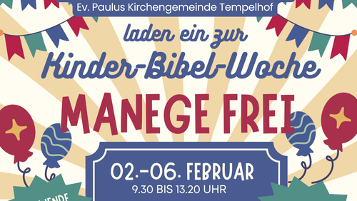 Bald ist es wieder so weit: In den Winterferien vom 2. bis 6. Februar 2026 laden wir alle Kinder von 5 bis 12 Jahren herzlich zur KinderBibelWoche (KiBiWo) in unserer Gemeinde ein – jeweils vormittags von 9.30 bis 12.30 Uhr in den Räumen der Ev. Kirchengemeinde Alt-Tempelhof & Michael.