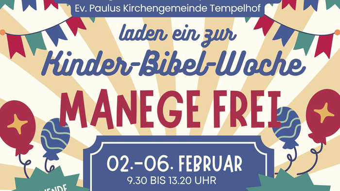 Bald ist es wieder so weit: In den Winterferien vom 2. bis 6. Februar 2026 laden wir alle Kinder von 5 bis 12 Jahren herzlich zur KinderBibelWoche (KiBiWo) in unserer Gemeinde ein – jeweils vormittags von 9.30 bis 12.30 Uhr in den Räumen der Ev. Kirchengemeinde Alt-Tempelhof & Michael.